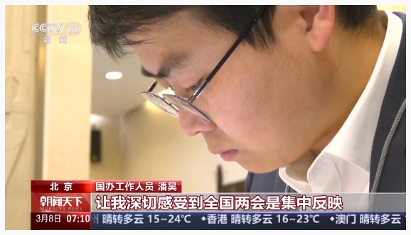 国办工作人员 陈科:他们提出的每一条建议都很鲜活,有深度有温度,凝结着民生关切。我们在这里旁听,原汁原味记录,坦诚沟通交流,是人民政府与代表委员沟通联系的直通车。