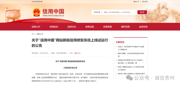 为贯彻落实党中央、国务院关于建立健全统一规范、协同共享、科学高效的信用修复制度的决策部署,按照《信用修复管理办法》(国家发展改革委令第36号)有关要求,“信用中国”网站新版信用修复系统将于2026年4月1日上线试运行(试运行期1个月)。现将有关事项公告如下。
