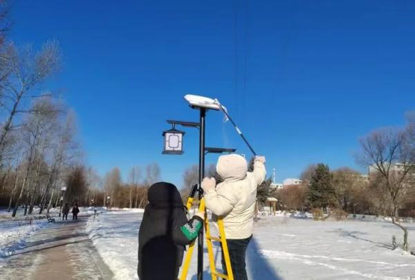 活动中,工作人员携带刮板、梯子、抹布等工具,对共享花园内所有路灯逐一进行细致清理。社区工作人员不畏严寒,分工协作,利用手中刮板刮掉积雪、抹布清除薄冰的方式,彻底清除了灯罩及太阳能灯板上的积雪与薄冰,确保每一盏路灯都能正常照明,经过数小时的认真作业,花园内所有路灯清理完毕。